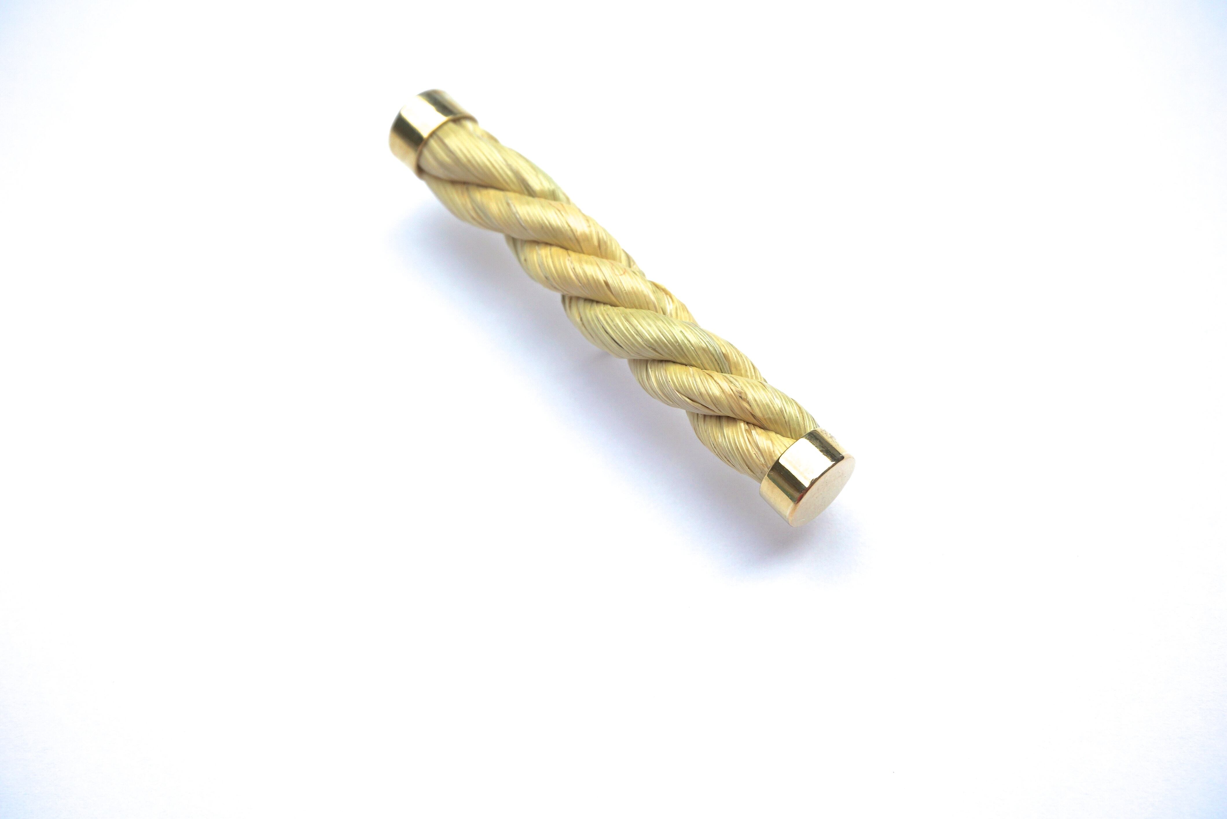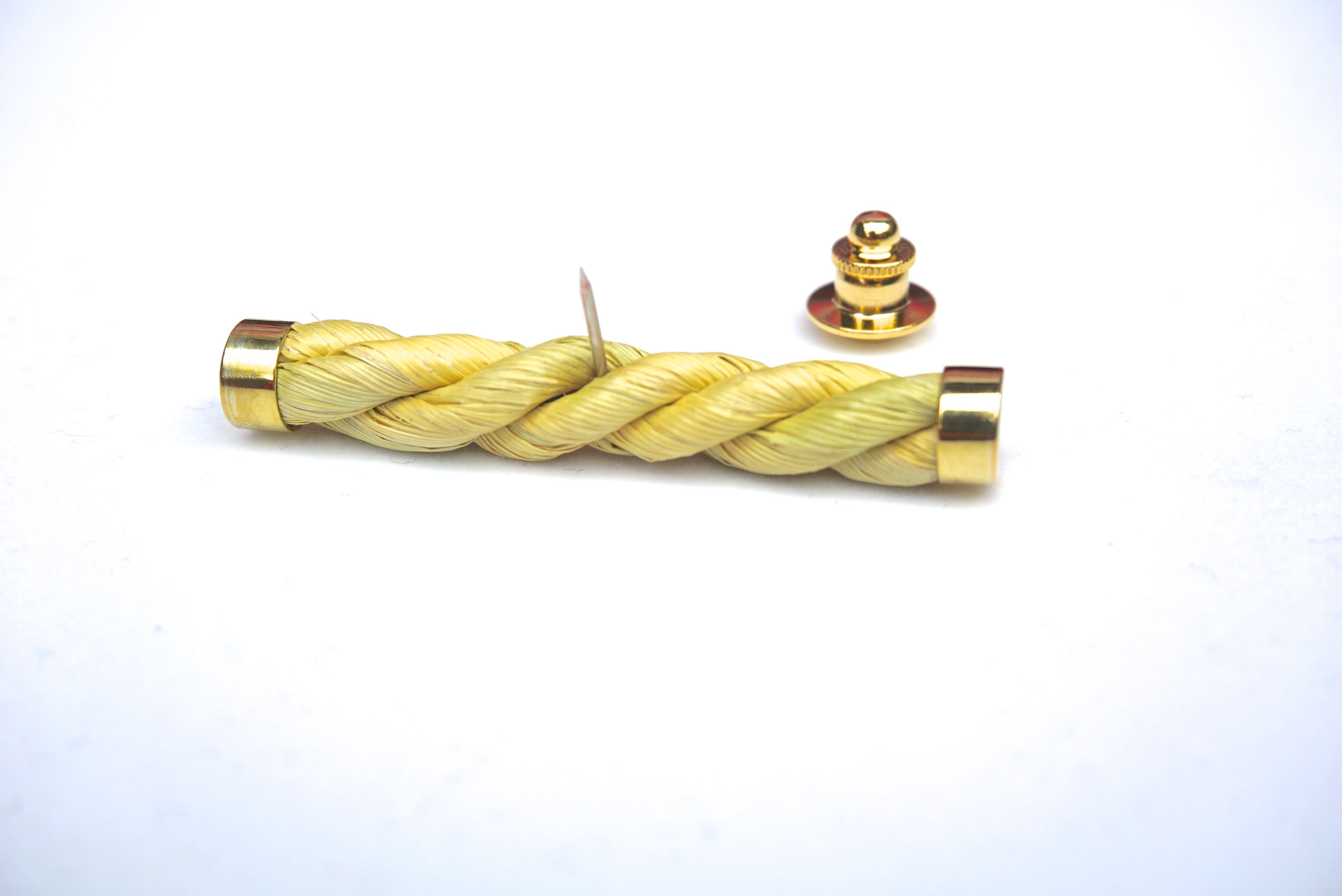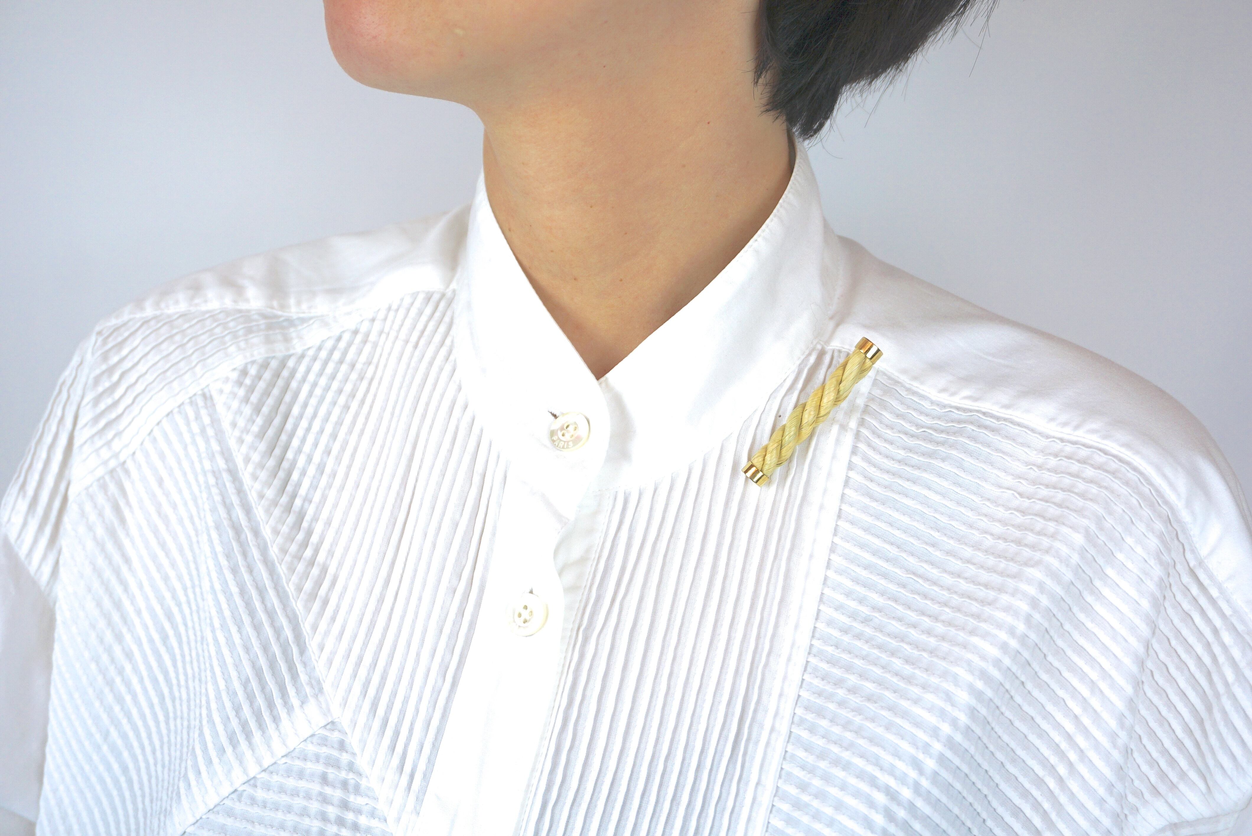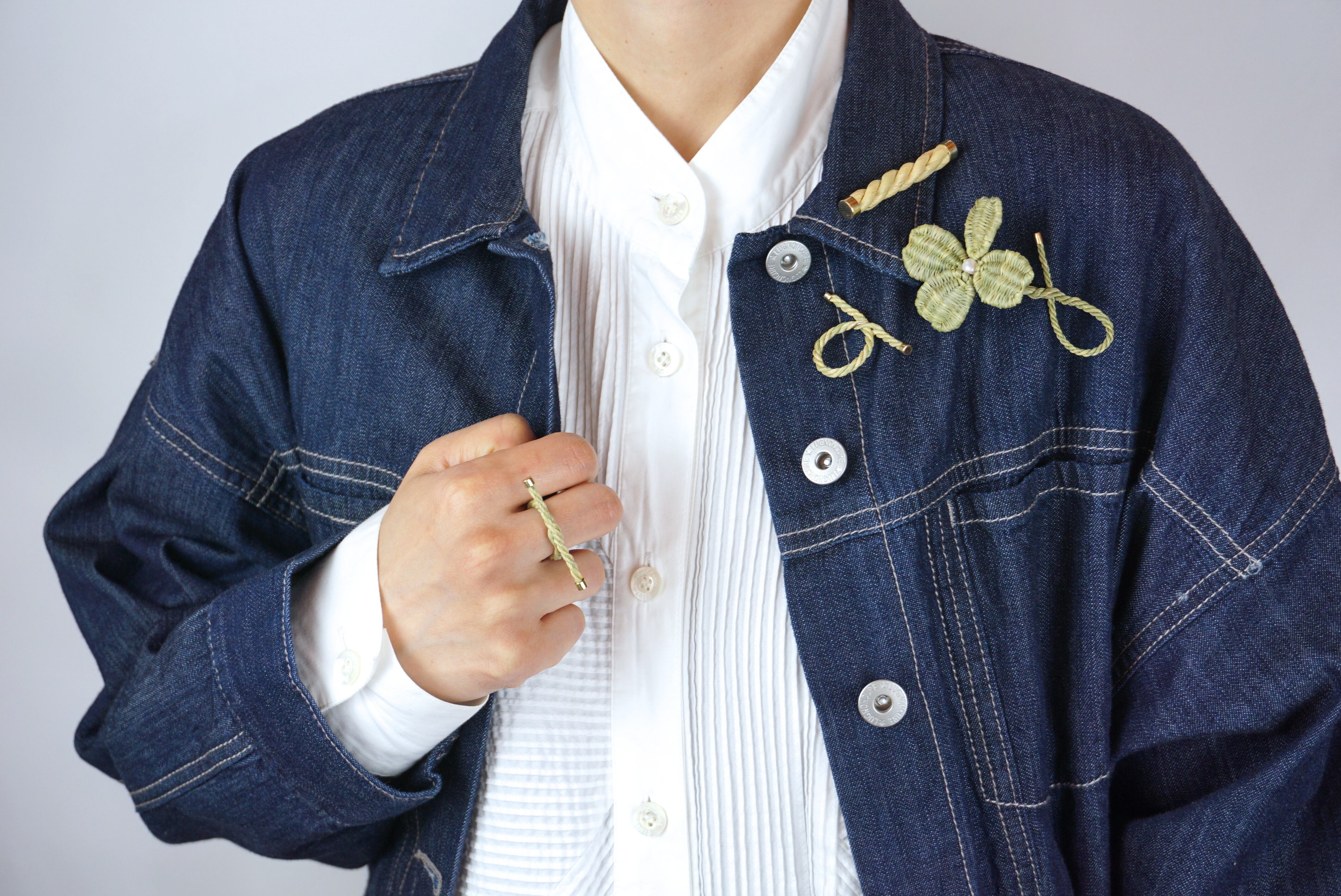 1本の縄綯いに、人生において自分らしい何らかのカタチで身を立てて頂きたいと願い、制作しました。縄ないのシンプルな曲線美は、さりげなく、胸元や襟元等に身に着けられるデザインとなっています。